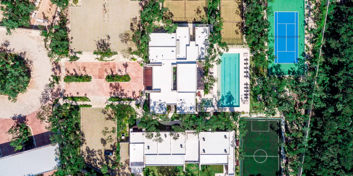 Amenidades: Recepción / Alberca semi-olímpica / Alberca para niños / Área de bar / Terraza y barra / Asoleaderos / Gimnasio de 170m² / Caseta de seguridad / Cancha de fútbol / 2 Canchas de pádel / Cancha de tenis / Salón de eventos para adultos y niños / Baños y vestidores.