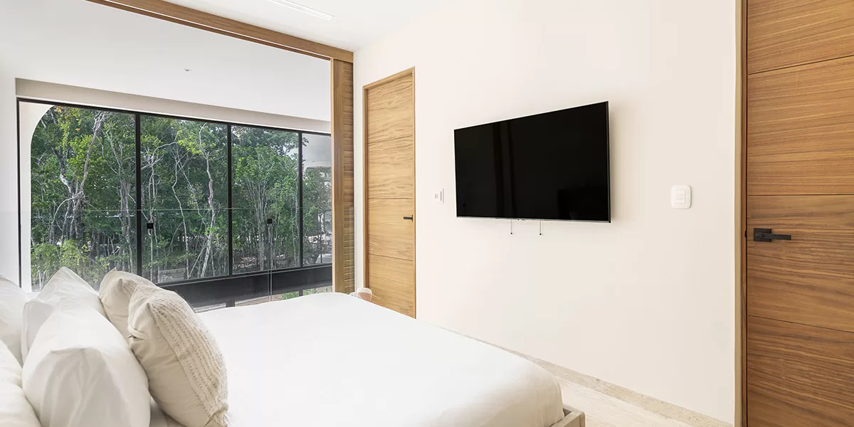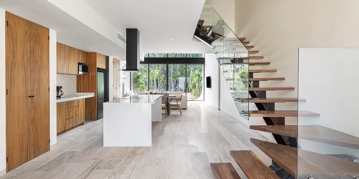 Cada villa de lujo en Tulum cuenta con alberca privada, baños en suite, área de comedor, y ventanales de piso a techo que ofrecen vistas espectaculares a la terraza y áreas de descanso. Disfruta de las amenidades de primer nivel como restaurante central, salón lounge, solárium, gimnasio de última generación, exuberantes jardines y acceso exclusivo a club de playa.